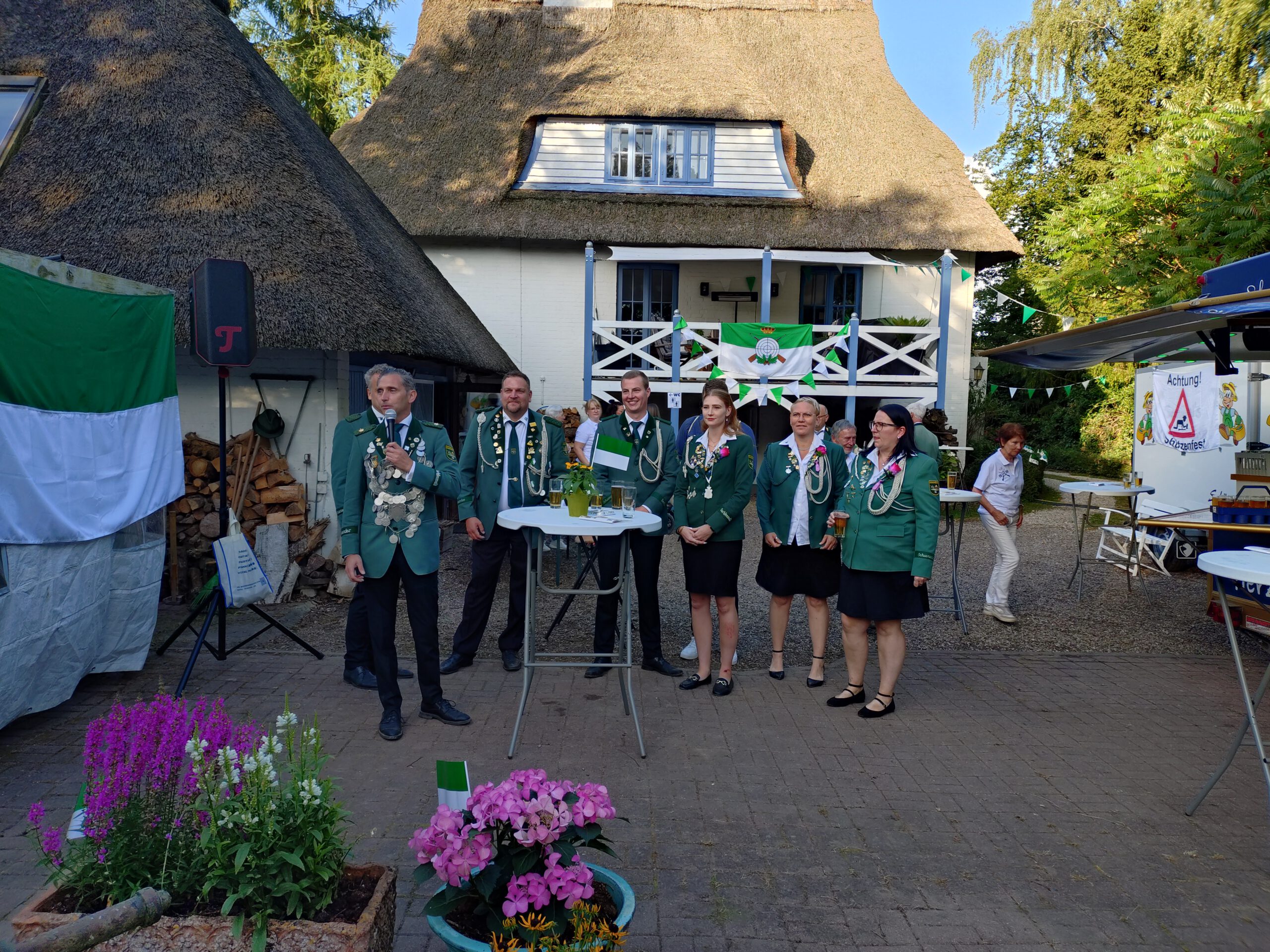 Der Tag begann bei Sonnenaufgang mit dem Königsfrühstück beim scheidenden König Christian Röbcke-Gronau. Mit geschmierten Brötchen, Live-Musik und guter Laune ging es in die Ochsenwerder Königsspiele, bevor danach die Kreisproklamation beginnen sollte.