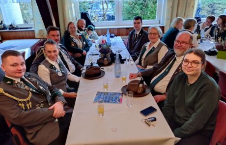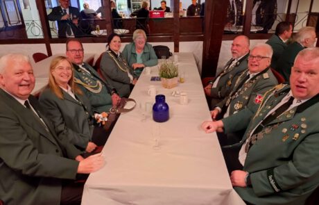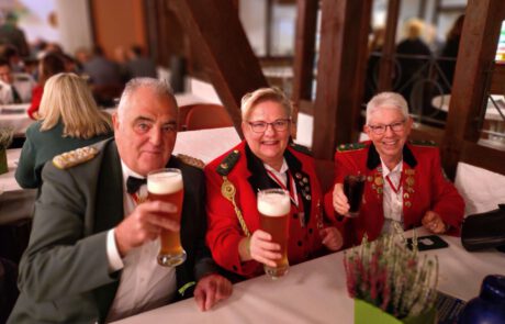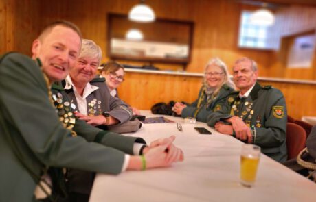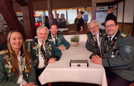 Nach reichlichen Weck-Runden gab der Landeskommandeur den Befehl für die Fahnen zum Einmarsch in die Festhalle, die Schützen folgten. Nach einigen offiziellen Worten ging für die ersten auf den Stand und ihre Abordnungen folgten rege. Entsprechend das Bild; oft stehen ganze Abordnungen daumendrückend und mitfiebernd im Vorraum. Doch Ergebnisse oder grobe Schätzungen gibt es keine, nur das Gefühl des Schützen. Denn die Ausrichter achten darauf, dass wenig Fakten nach außen dringen. Nun heißt es für alle: Gespannt sein… Daumen drücken… bis zum Landeskönigsball am 6. Dezember…! Wir hoffen inständig, erneut mindestens einen Titel für unseren Kreis zu erlangen!